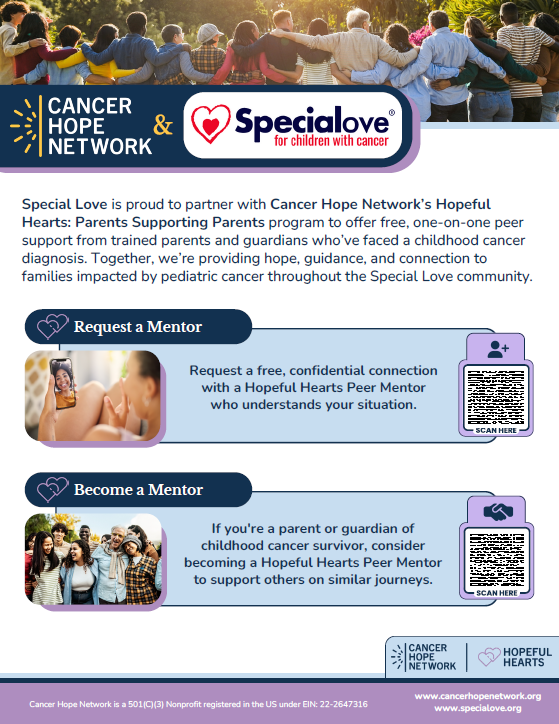 Special Love has partnered with Cancer Hope Network to bring their Hopeful Hearts: Parents Supporting Parents program to our community. This free, one-on-one peer mentor program connects parents and caregivers of children with cancer to trained mentors—other parents who have walked a similar journey and are ready to offer support, encouragement, and understanding.